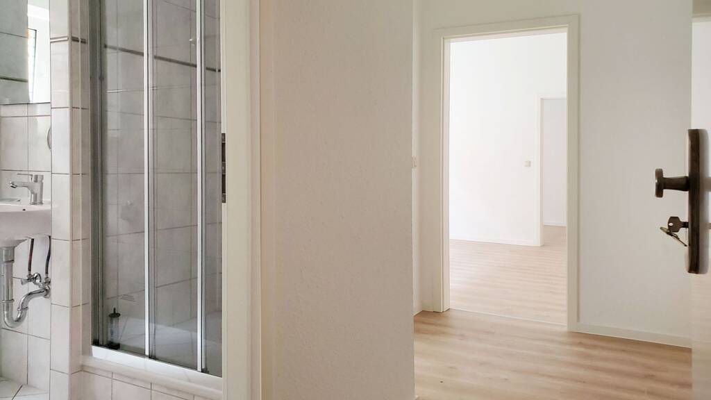 - 1 Flur - 1 Küche mit neuer Einbauküche - 2 miteinander verbundene Zimmer (Durchgangszimmer) - Tageslichtbad mit Dusche - Waschmaschinenanschluss in der Küche (Nischenbreite 60 cm) - Wiese hinter dem Haus, z. B. zum Wäschetrocknen