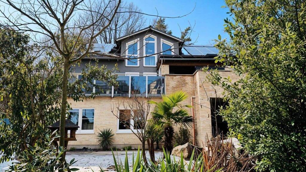 Über eine Außentreppe gelangen Sie nach oben zum Eingang Ihrer 5-Zimmer-Eigentumswohnung. Im Entreé eröffnet sich Ihnen ein offener Wohn- und Essbereich mit angegliederter, moderner Küche mit Granitarbeitsplatten und Kücheninsel mit versenkten Steckdosen. Zahlreiche umlaufende, teilweise bodentiefe Fenster schaffen eine lichtdurchflutete und freundliche Atmosphäre.