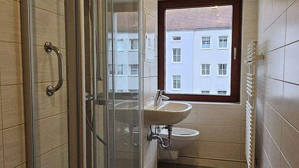 Die renovierte Wohnung verfügt über Wohnzimmer, Schlafzimmer, Kinderzimmer, Küche und Flur sowie modern gefliestes Bad mit ebenerdiger Dusche.