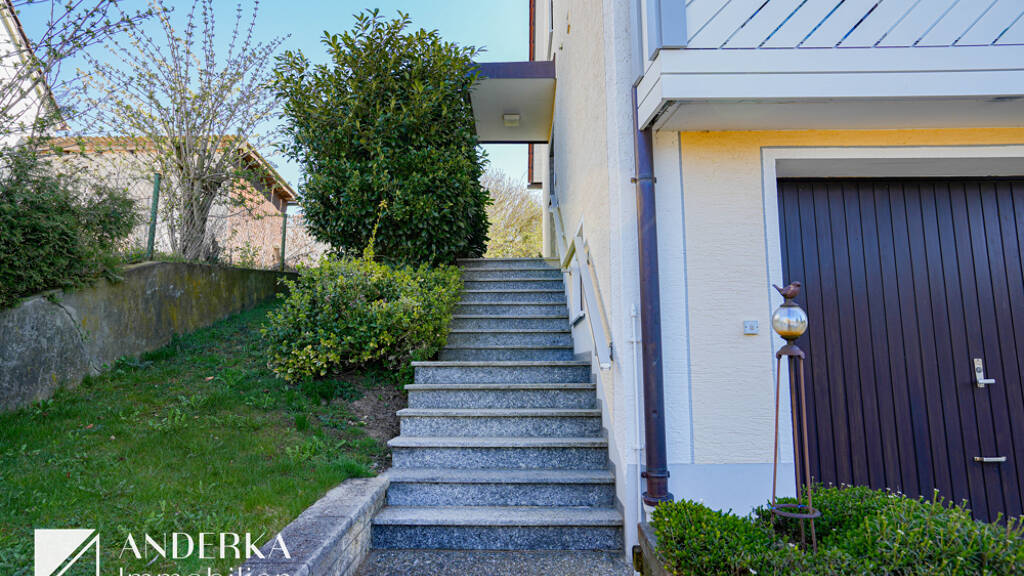 Bereits die weitläufige Hofeinfahrt bietet ausreichend Platz für Fahrzeuge und wird durch eine Einzelgarage ergänzt. Durch die Hanglage liegt die unterste Ebene des Hauses im Kellerbereich, während sich der eigentliche Hauseingang über eine Treppe erschließt. Das Erdgeschoss befindet sich dadurch leicht erhöht und vermittelt ein angenehmes Wohngefühl mit Ausblick.