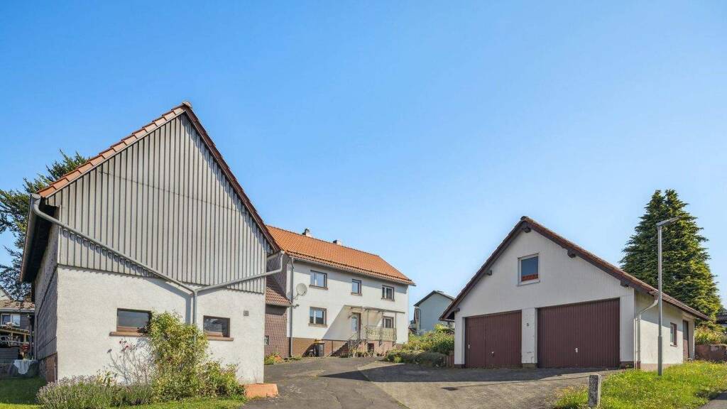 Zum Verkauf steht eine charmante Hofreite in Grebenhain (Ortsteil Herchenhain) mit insgesamt 8 Zimmern verteilt auf zwei Wohnetagen. Das Haus wurde im Jahr 1957 in Massivbauweise errichtet und in 1967 um ein weiteres Wohngeschoss aufgestockt. Zudem wurden in 2013 das Dach des Haupthauses sowie des kleineren Stallgebäudes erneuert. Auf einer Wohnfläche von 155,61 m² bietet es ausreichend Platz für eine große Familie oder als Mehrgenerationenhaus. Die Liegenschaft soll in einem ungeräumten Zustand auf den neuen Käufer übergehen. Das Grundstück umfasst insgesamt großzügige 2.638 m² und ist gepflegt angelegt. Es wäre durchaus möglich, dass das Grundstück nochmals geteilt werden kann und so 1-2 zusätzliche Bauplätze entstehen können. Die Ausstattung des Hauses ist einfach gehalten, bietet jedoch viel Potenzial für individuelle Gestaltungsmöglichkeiten. Eine Garage sowie eine Doppelgarage stehen für die Unterbringung von Fahrzeugen zur Verfügung. Die Einbauküche ist im Kaufpreis enthalten und der Garten lädt zum Entspannen und Verweilen ein. Das Haus liegt in einer ruhigen Wohnsiedlung und bietet eine schöne Aussicht auf die umliegende Landschaft.