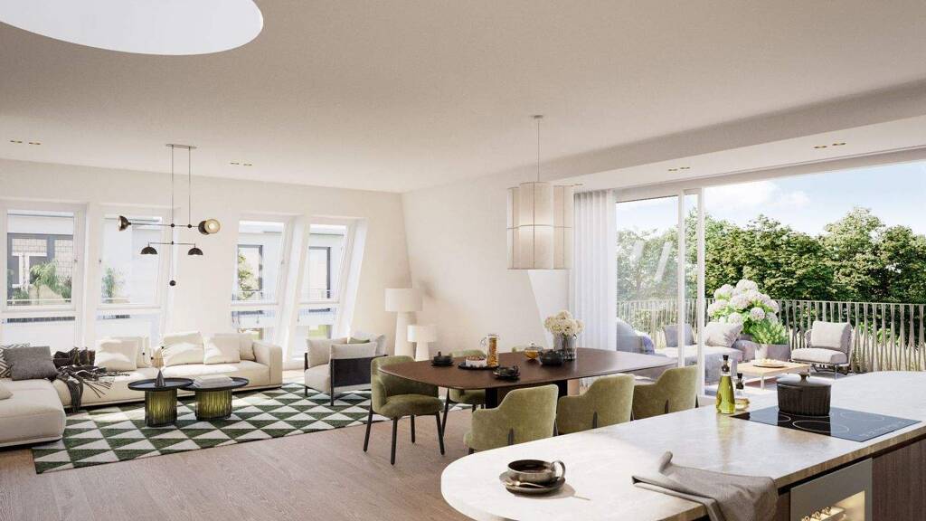 Im Eingangsbereich findet eine große Garderobe Platz. Das Herzstück der Wohnung bildet der lichtdurchflutete Wohn-, Ess- und Kochbereich. Große Fensterfronten nach Westen schaffen eine helle Atmosphäre und ermöglichen einen direkten Zugang zur Terrasse sowie zum ca. 191 m² großen Privatgarten - ein perfekter Rückzugsort für die ganze Familie.
