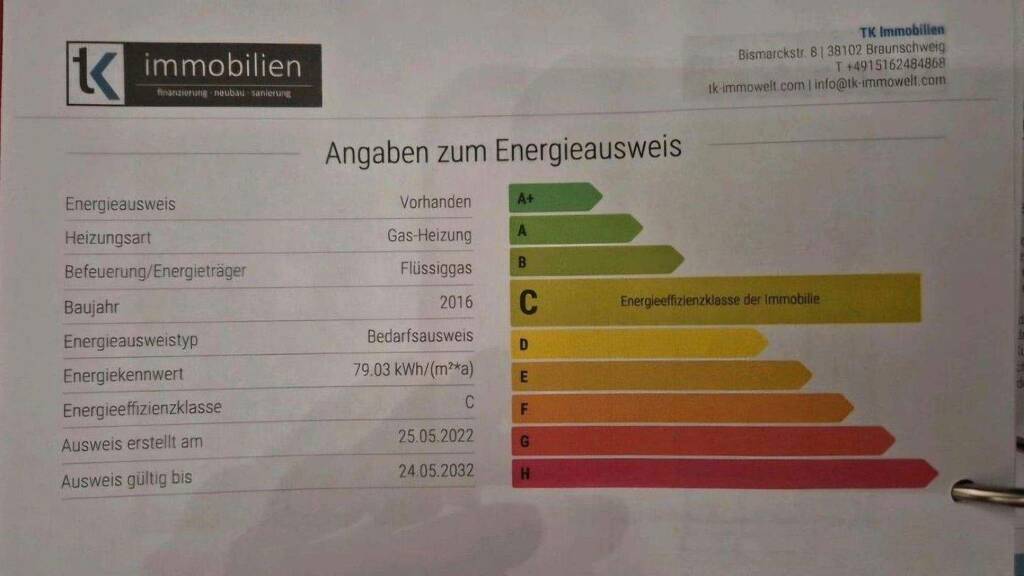 Energieausweis liegt vor, Energiekennwert 79,03 kWh, Energieeffizienzklasse C, Energieträger Flüssiggas