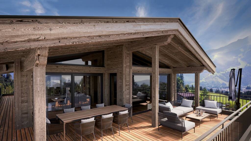 Im Dachgeschoss befindet sich das Herzstück des Hauses: ein weitläufiger, lichtdurchfluteter Wohn- und Essbereich. Großzügige Fensterfronten sorgen für eine freundliche, helle Atmosphäre. Von hier gelangt man direkt auf die großzügige Terrasse, die zu geselligen Stunden im Freien einlädt und einen traumhaften Ausblick auf die umliegende Bergwelt eröffnet.