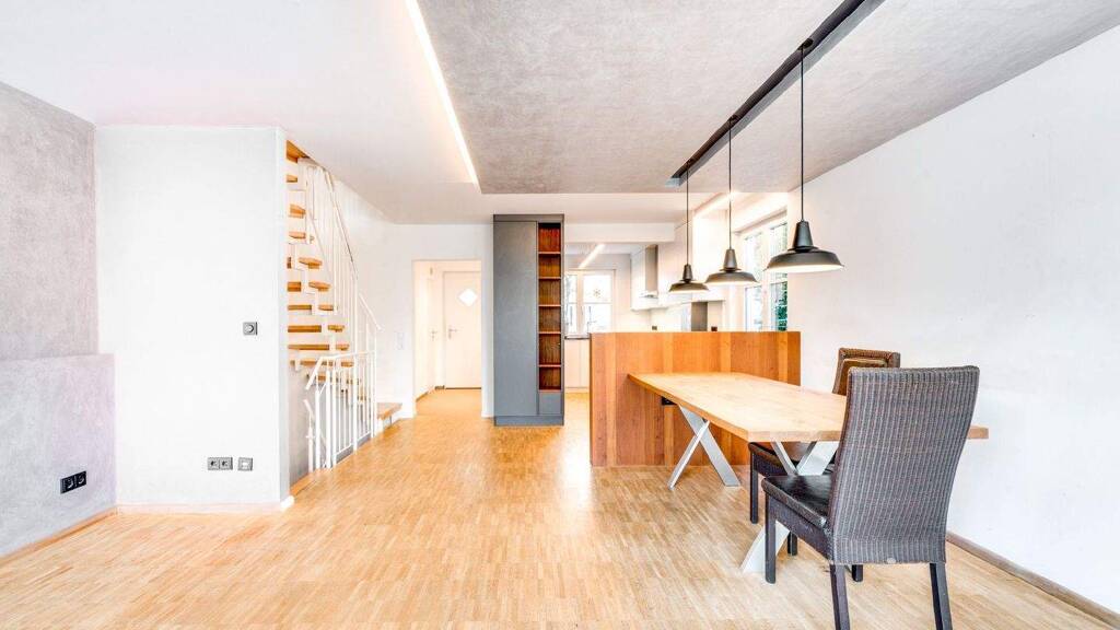 Das Herzstück des Erdgeschosses bildet ein offener, großzügiger Wohnbereich mit hellem Stäbchenparkettboden. Die moderne Schreinerküche ist harmonisch in den Wohnraum eingebunden und schafft gemeinsam mit dem Wohnzimmer eine offene und einladende Einheit. Über dem Esstisch befindet sich ein abgehängtes Deckenelement mit integrierter Beleuchtung, das diesen Bereich besonders hervorhebt. Von hier aus gelangen Sie auf die Terrasse, die mit einer gemütlichen Lounge-Ecke zum Verweilen einlädt. Ein kleines Gartenhaus sorgt für zusätzlichen, praktischen Stauraum. Vom Eingangsbereich aus erreichen Sie zudem das renovierte Gäste-WC. Darüber hinaus ist das gesamte Erdgeschoss mit Rollläden ausgestattet. Über eine offene Holztreppe, die mit einem dezenten weißen Geländer aus Metall geziert ist, gelangt man in das erste Obergeschoss. Hier befinden sich zwei gut geschnittene, helle Zimmer. Das Tageslichtbad wurde 2022/2023 hochwertig erneuert. Es ist ausgestattet mit einer großzügigen Walk-In-Dusche, WC, einem Spiegelschrank und einem Waschtischunterschrank.