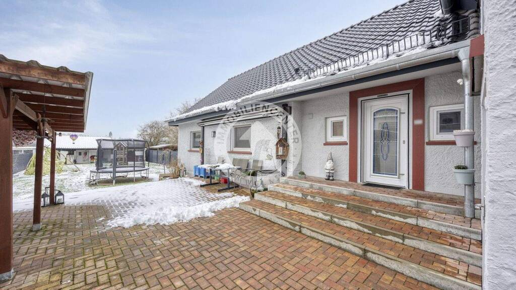 Der große Garten bietet vielfältige Nutzungsmöglichkeiten: befestigte Fläche für einen Pool, Holzterrasse und Rasenbereich. Das Grundstück ist komplett eingefriedet. Kindergarten, Einkaufsmöglichkeiten, Busverbindungen und Schulen sind schnell erreichbar - ideal für Familien.