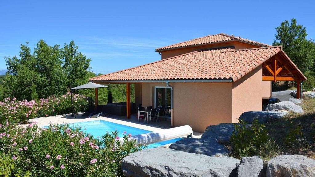 Dop Makelaars offers: Les Rives de l’Ardèche 115/ Rue Marie Curie 274. Detached villa with private swimming pool in the immediate vicinity of the authentic town of Vallon-Pont-d’Arc, located in the Ardèche, with beautiful views of the Ardèche river. Completed in 2011, the villa is located in the Domaine les Rives de l'Ardèche park, consisting of 132 detached, attractive villas, all situated on spacious plots ranging from 500 to 1,800m2 of private land. The park is fully equipped with all modern conveniences. There is a large communal swimming pool, tennis courts, and a children's playground. The surrounding area is ideal for walking, cycling, mountain biking, canoeing, swimming, mountain climbing, horse riding, etc. The villa is fully furnished and equipped for 8 people and is located on a very spacious plot of 620m² with a living area of 112m². Ground floor Entrance/hall with toilet and storage space, spacious living room with French doors to a covered terrace, a comfortable sitting area, an open kitchen equipped with all appliances such as an oven, dishwasher, microwave, and stove, and a large refrigerator with freezer compartment. This floor also has a bedroom, a bathroom with bath and washbasin, and a separate toilet. First floor Here you will find three double bedrooms, a second bathroom with shower, toilet, and washbasin, as well as the loggia, which is a wonderful place to relax on cooler evenings. The entire house is equipped with luxury sanitary facilities and beautiful tiling, and both the ground floor and the first floor are finished with beautiful tiled floors. Heating is provided by central heating radiators. The four bedrooms have air conditioning. The house is also equipped with solar panels. The architecturally landscaped garden features a private swimming pool with an electric roller cover. The driveway offers space for two cars, one of which can be parked under the carport. There is also a storage shed next to the house. Purchase price: €445,000 (inventory in consultation)