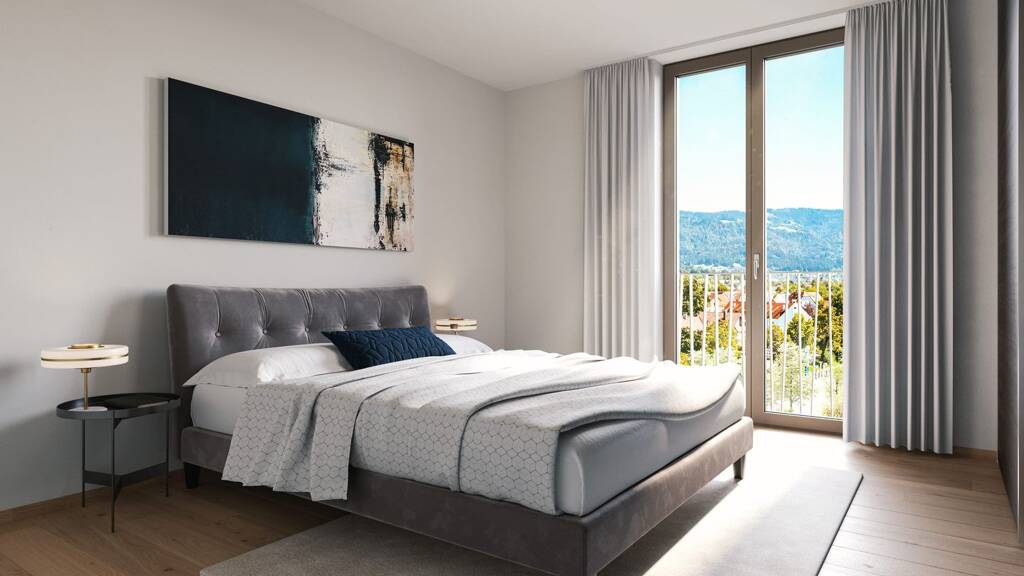 - ein Schlafzimmer mit Zugang zur Loggia mit Blick auf die Berge