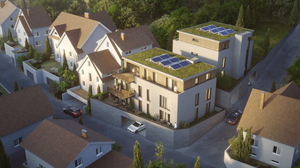 In bester Ortsrandlage entstehen zwei lichtdurchflutete architektonisch attraktive Mehrfamilienhäuser in unterschiedlicher Ausführung. Die Bauausführung erfolgt sowohl in Massivbauweise kann auch teilweise in Holzbauweise ausgeführt werden. Das gesamte Ensemble fügt sich mit seiner solitären Architektur harmonisch in das gewachsene Wohnumfeld ein und bietet dazu einen hervorragenden Blick in das Tal.