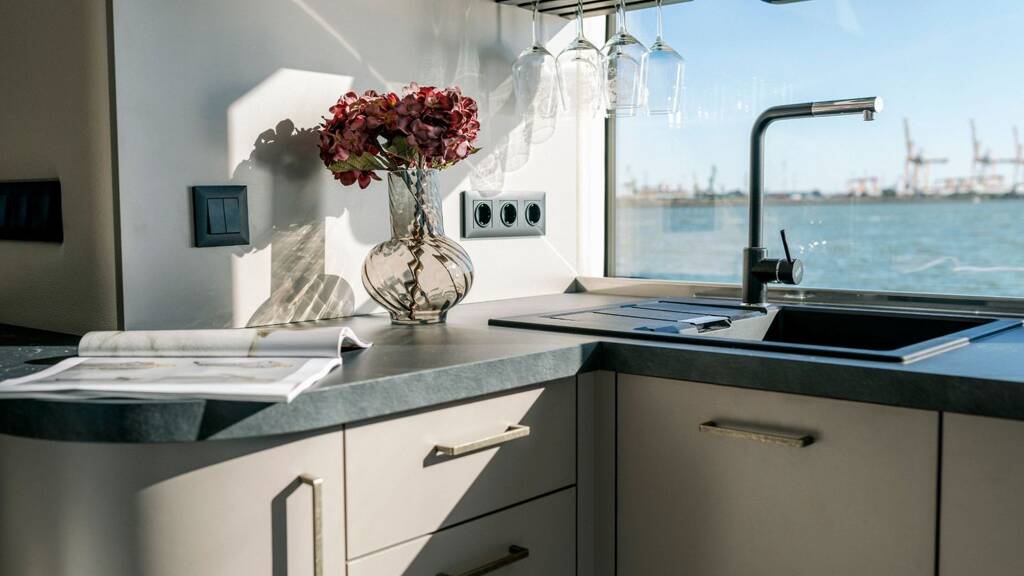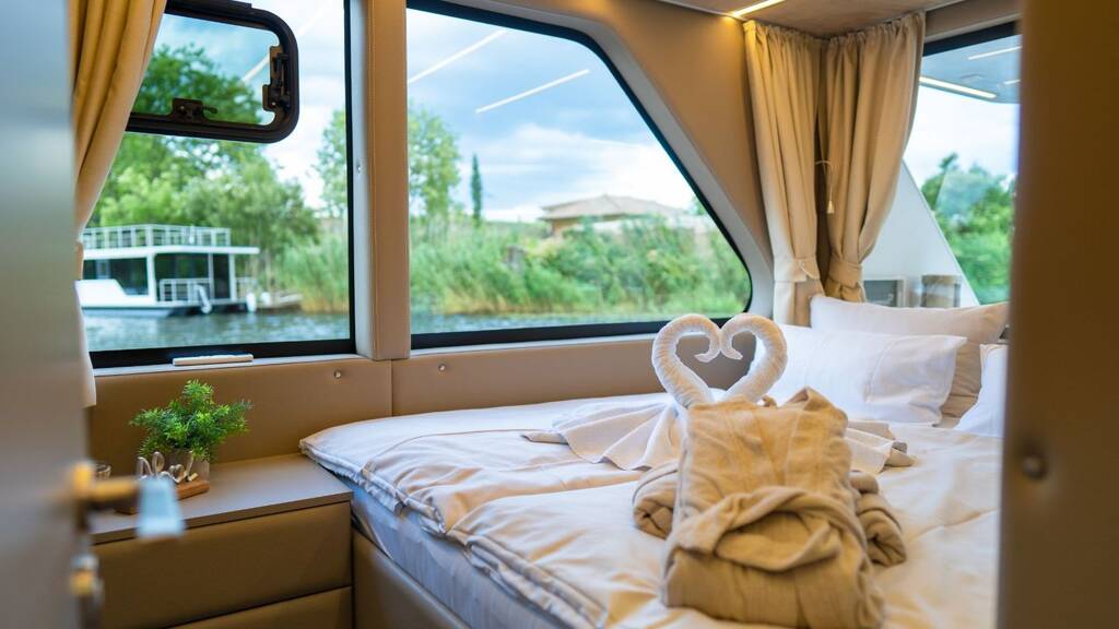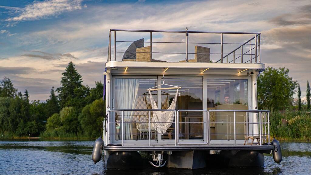 Das Hausboot besticht durch eine moderne Ausstattung und wird komplett möbliert übergeben. Die Außenküche mit Heckterrasse lädt zum gemütlichen Kochen und Verweilen ein. Entspannen können sich Ihre Gäste auf der großen Dachterrasse, wo sie bei einem Sundowner die herrliche Aussicht genießen.