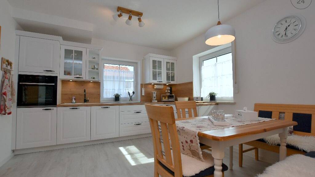 Die voll ausgestattete Wohnküche mit Spülmaschine, Kühl-Gefrierkombi verfügt über einen Essplatz für 4-5 Personen.