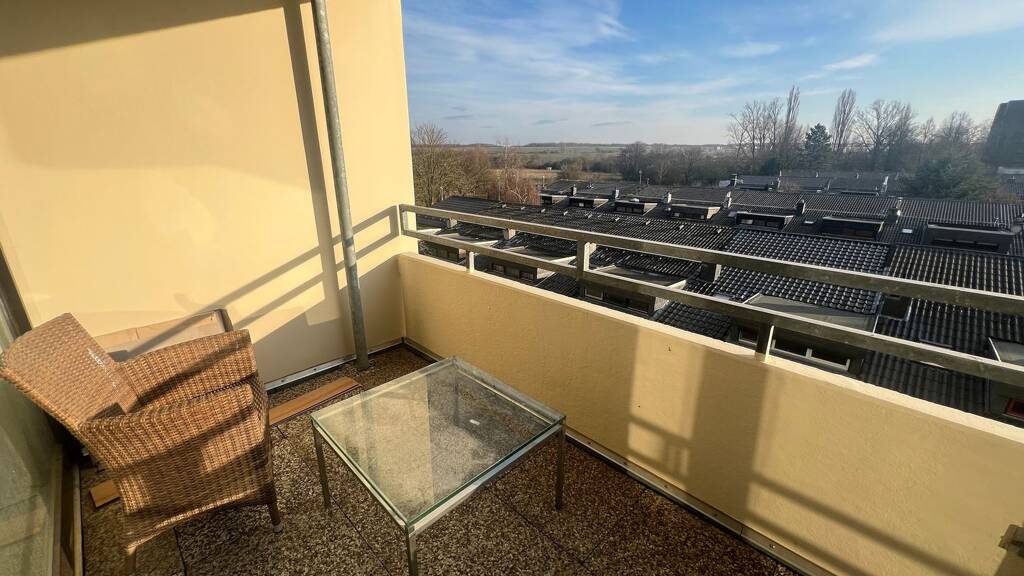 Der rückwärtige Bereich der Wohnung beherbergt das lichtdurchflutete Schlafzimmer, das eine angenehme Ruhezone bietet. Das großzügige Wohnzimmer, ebenfalls mit viel Tageslicht, bietet viel Platz für individuelle Gestaltungsmöglichkeiten und lädt zum Entspannen ein. Sowohl vom Schlafzimmer als auch vom Wohnzimmer aus hat man Zugang zu der überdachten Loggia mit Südausrichtung. Diese bietet nicht nur einen geschützten Außenbereich, sondern auch einen schönen Ausblick über die Dächer der Umgebung und in die grüne Natur, was den Aufenthalt dort besonders angenehm macht.