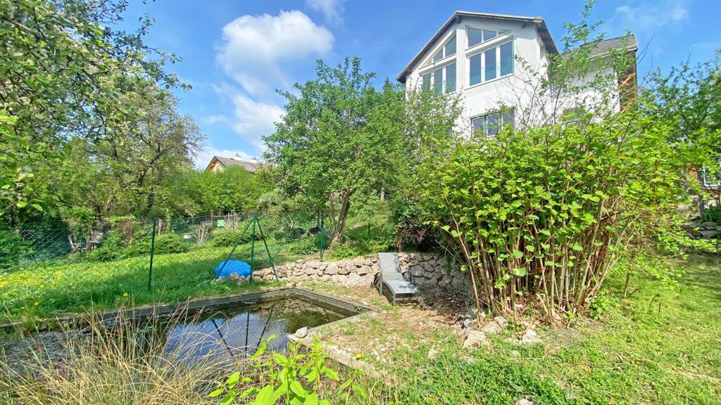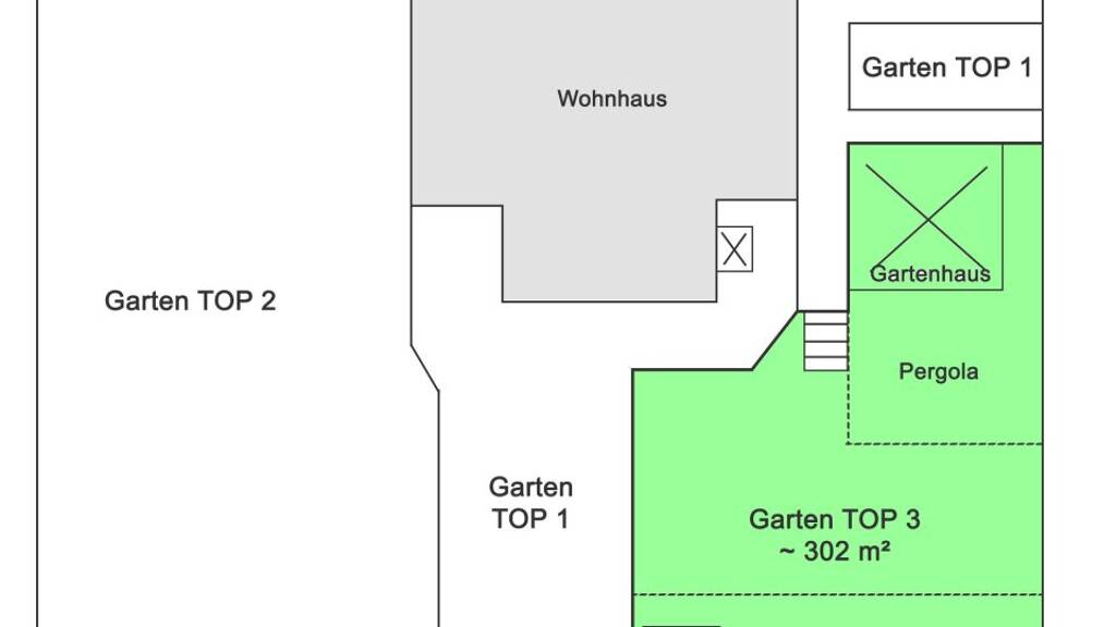 Der südseitige, leicht hanglagige gut 300 m² große Garten ist der Wohnung zugeordnet und ist über die Ostseite des Hauses zugänglich. Hier befindet sich ein ca. 23 m² großes, voll isoliertes Gartenhaus, mit angeschlossener Terrasse mit Pergola sowie ein Schwimmteich mit Natur- und Schwimmbereich.