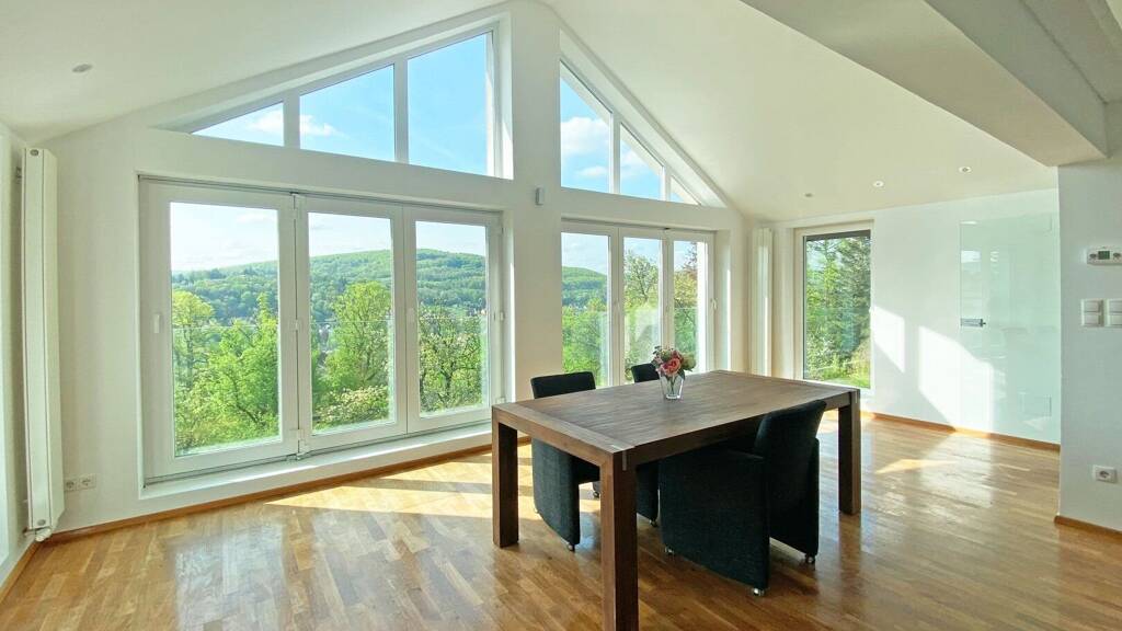 2010 wurde das Dachgeschoß komplett entkernt und hochwertig ausgebaut, renoviert und saniert. Der Zugang zur 2,5-Zimmerwohnung erfolgt im Erdgeschoß, über das eigene, zur Wohnung gehörende Stiegenhaus, wo auch ein Abstellraum mit Waschmaschinenanschluss, ein WC mit Fenster und ein weiterer Stauraum, der als Garderobe verwendet werden kann, liegen. Schon beim Eingang in die Wohnung erschließt sich der atemberaubende Blick in den gegenüberliegenden Wienerwald, sogar die historische Turmvilla in Pressbaum ist zu sehen. Der ca. 60 m² große Wohn-, Ess-, Küchenbereich mit offenem Giebel bietet eine stylische Intuo-Designerküche mit Markengeräten. Das Highlight der Wohnung sind sicher die beiden südlichen Panoramafenster mit 3-fach verglasten Schiebeelementen mit atemberaubendem Blick in den gegenüberliegenden Wienerwald.
