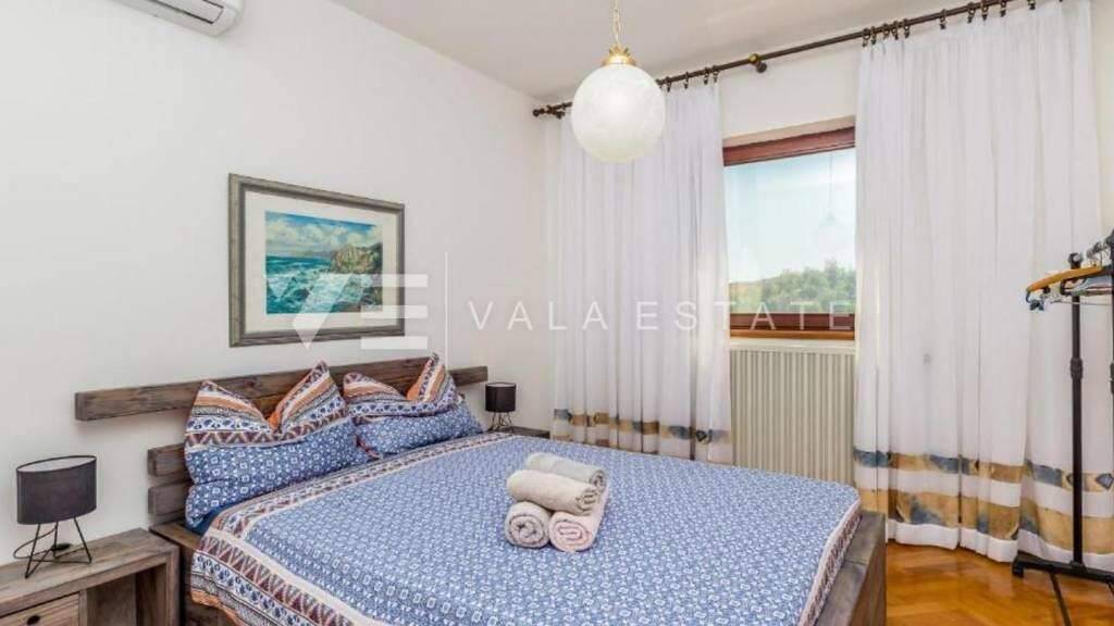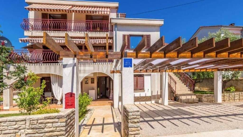 Immobilieninsel Krk, Umgebung der Stadt Krk zum Verkauf steht ein freistehendes Haus mit drei separaten Wohnungen in ruhiger Lage auf der Südwestseite der Insel Krk. Die Gesamtwohnfläche des Hauses von 410 m2 verteilt sich auf ein Erdgeschoss und ein Hochdachgeschoss. Im Erdgeschoss des Hauses befinden sich ein Studioapartment und ein Zweizimmerapartment mit Zugang zu einer überdachten Terrasse. Im ersten Stock und im hohen Dachgeschoss, das über eine Außentreppe erreichbar ist, befindet sich eine einfache zweistöckige Wohnung mit vier Schlafzimmern und einer Terrasse mit wunderschönem freien Blick auf das Meer. Es ist von einem wunderschönen, mit mediterranen Pflanzen bepflanzten Garten umgeben, in dem es einen gemauerten Grill und mehrere mit einer Pergola überdachte Parkplätze gibt, außerdem gibt es genügend Platz für den Bau eines Swimmingpools. Das Haus ist hochwertig gebaut, komplett möbliert, gepflegt, verfügt über Multisplit-Klimaanlage und elektrische Heizkörper, ordnungsgemäße Dokumentation und ist bezugsfertig. Die Lage ist ruhig und am Rande der Grünzone, nur 550 m vom Meer und nicht weit von schönen Stränden entfernt. Diese Immobilie ist eine großartige Investition für die touristische Vermietung, aber auch für einen persönlichen Aufenthalt.