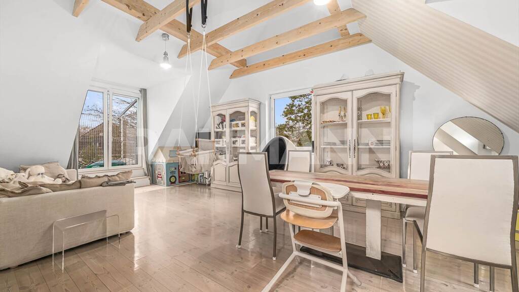 Treten Sie ein in ein Zuhause, das Weite atmet: Diese sonnendurchflutete High-End-Dachgeschosswohnung (3. Etage) ist 2019 im Rahmen einer umfassenden Sanierung neu entstanden. Sie vereint gehobenen Wohnkomfort mit einem unverwechselbaren architektonischen Charme. Hohe Decken, sichtbare Holzbalken und ein durchgehend verlegter, weiß geseifter Holzboden schaffen eine luftige, helle und zugleich wunderbar warme Atmosphäre – ein echter skandinavischer Wohntraum. Dieses Liebhaberstück bietet großzügigen Raum und ideale Voraussetzungen für Paare, Familien oder Designbegeisterte, die das Besondere suchen. Die Highlights auf einen Blick: Industrie-Chic trifft Scandi-Style: Eine maßgefertigte Lofttür aus Glas und schwarzem Stahl bildet das stylische Entrée vom Flur in den Wohnbereich. Das Herzstück: Die hochwertige Einbauküche mit modernsten Markengeräten von Neff und viel Stauraum fügt sich perfekt in den offenen Wohn- und Essbereich ein. Wellness-Bad: Sehr geräumiges Tageslichtbad mit ebenerdiger Regendusche, separater Badewanne und elegantem Design. Clevere Extras: Maßgefertigte Insektenschutz-Schiebesysteme an allen Fenstern, elektrische Rollläden (Vollverdunkelung) in den Schlafräumen und ein maßgefertigter Einbauschrank im dritten Zimmer. Stauraum-Wunder: Ein riesiger Dachboden (direkt aus der Wohnung zugänglich) sowie ein eigener Kellerraum bieten außergewöhnlich viel Platz. Praktisch: Separates Tageslicht-Gäste-WC mit integrierten Anschlüssen für Waschmaschine und Trockner. Raumaufteilung & Wohngefühl Der großzügige Flur ist der zentrale Ausgangspunkt der Wohnung und gibt durch die eindrucksvolle Industrie-Lofttür sofort den Blick in den Lebensmittelpunkt der Immobilie frei. Hier verschmelzen beeindruckende Deckenhöhen und die sichtbare Dachkonstruktion zu einer strukturiert-modernen, gemütlichen Loft-Atmosphäre. Drei weitere Zimmer lassen sich völlig flexibel und ganz nach den eigenen Bedürfnissen als Schlaf-, Kinder-, Gäste- oder Arbeitszimmer aufteilen. Alle Räume sind hervorragend geschnitten und hell. Ihre grüne Oase im Freien Ein weiteres Highlight ist der geräumige Balkon mit herrlichem Blick ins Grüne. Eine maßangefertigte Premium-Markise, die sich über die gesamte Balkonbreite erstreckt, sorgt für perfekten Sonnenschutz und macht den Außenbereich zur idealen Location, um zu grillen und zu verweilen. Zusätzlich lädt der idyllische Garten im Hinterhof zur Mitbenutzung ein. Gut zugängliche und geschützte Fahrradstellplätze runden das Angebot im Außenbereich ab.