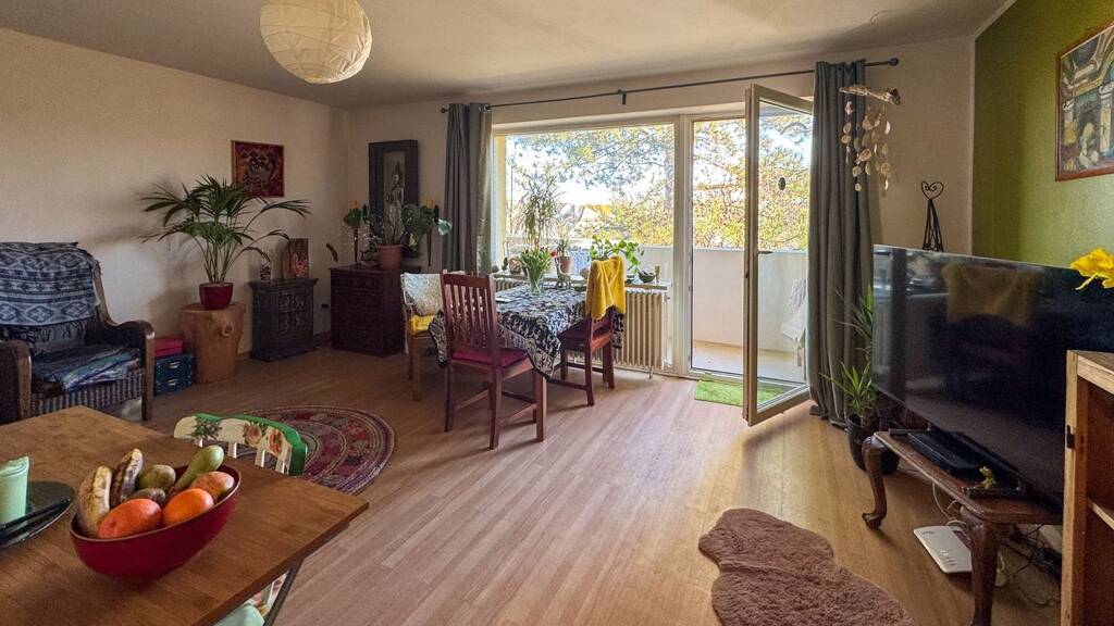 Nach dem Eintreten gelangen Sie in die Diele mit praktischer Abstellmöglichkeit. Von hier aus sind alle Räume bequem erreichbar - das Badezimmer, das Schlafzimmer sowie das Wohnzimmer. Das ca. 9 m² große Schlafzimmer ist kompakt geschnitten, bietet trotzdem die praktische Möglichkeit, Wohnen und Schlafen klar voneinander zu trennen.Das Wohnzimmer bildet den zentralen Lebensmittelpunkt der Wohnung. Von hier aus gelangen Sie auf den Balkon mit Blick ins Grüne - ein echtes Highlight, das trotz der zentralen Lage für Ruhe sorgt.