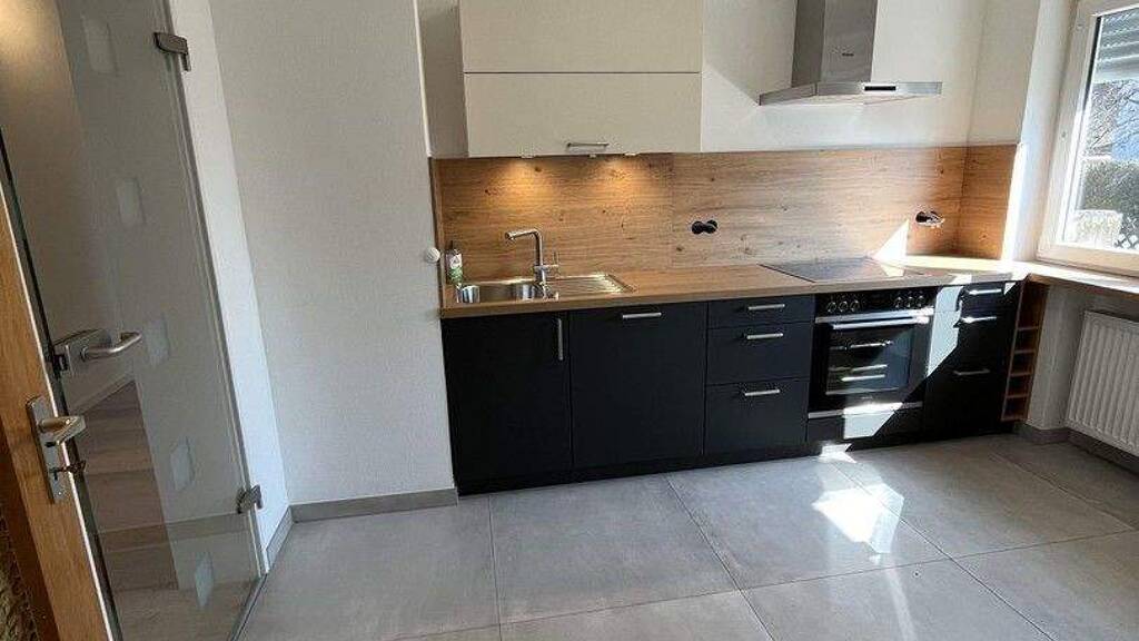 Küche: Moderne Küche mit Marken-Elektrogeräten. Geschirrspüler (AEG), Herd u. Kochfeld (Siemens) und Umluft Dunstabzug. Der Boden wurde neu gefliest.