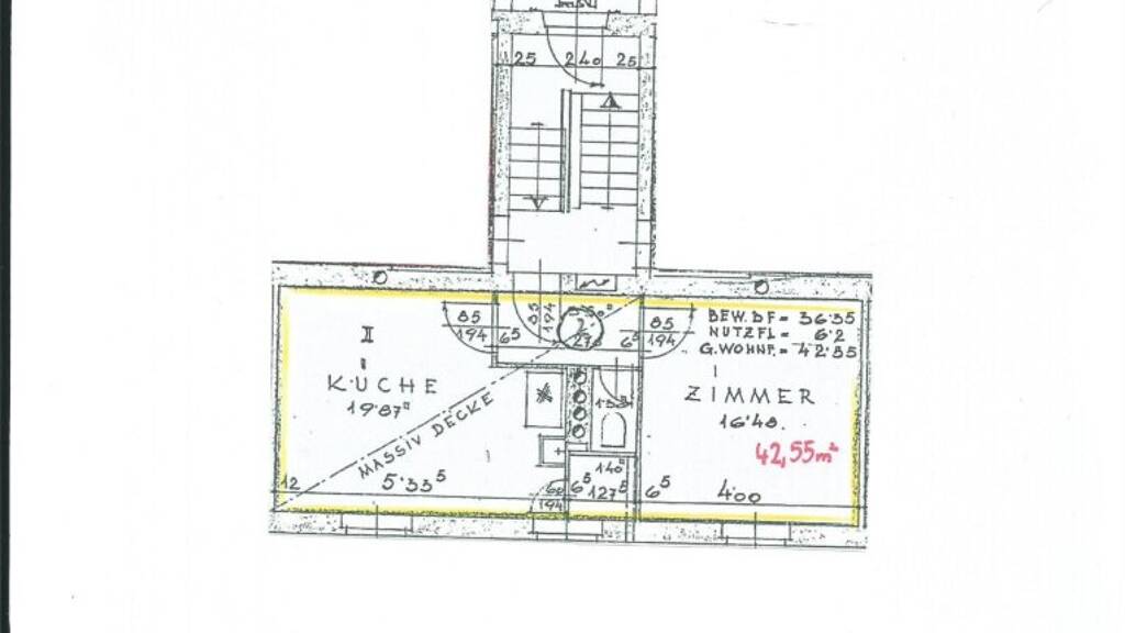 Das Haus selbst und auch die Zufahrt wurden schon saniert. Die Wohnung allerdings bedarf einer Generalsanierung. Es ist noch kein Badezimmer vorhanden. Toilette und Zentralheizung gibt es schon.