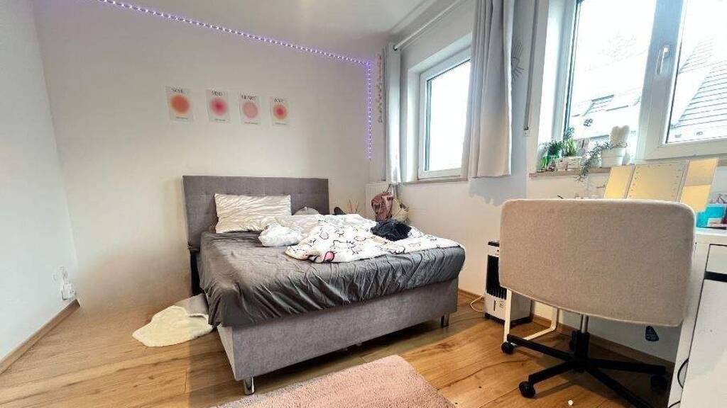 Das ausgebaute Dachgeschoss mit etwa 24 m² ist vielseitig nutzbar! Es bietet sich hervorragend als Teenager-Zimmer an, da es genügend Platz für ein Bett, einen Schreibtisch und Stauraum für persönliche Dinge bietet. Auch als Hobbyraum ist es eine tolle Option, da die große Dachflächenfenster für viel natürliches Licht sorgen und eine angenehme Atmosphäre schaffen. Der dunkelbraune Laminatboden verleiht dem Raum eine gemütliches Raumambiente.