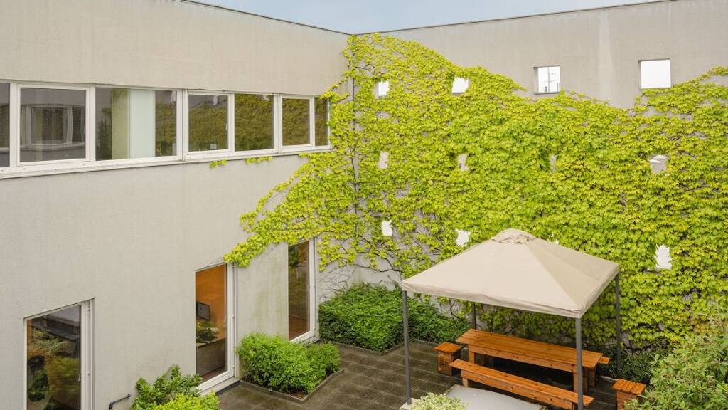 Die ruhige und begrĂĽnte Terrasse, im Innenhof schafft fĂĽr die Mitarbeiter entspannte Pausen.