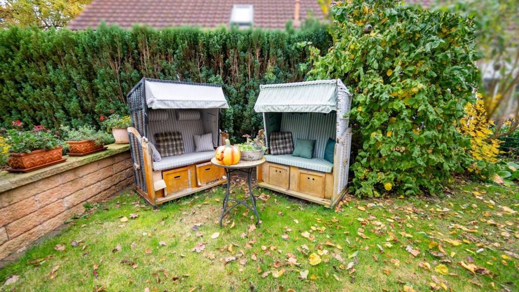 Der helle Wohn- und Essbereich bildet das Herz des Hauses - offen, freundlich und mit direktem Zugang zur Terrasse. Unter der Markise genießen Sie entspannte Stunden im Freien, während der liebevoll angelegte Garten mit seinem kleinen Teich für eine friedliche Atmosphäre sorgt.