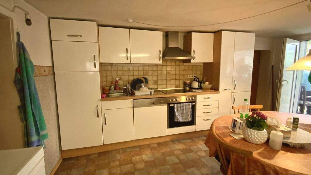 Das erste Obergeschoss wurde 2009 komplett renoviert und zur Wohnung umgebaut. Im ehemaligen Festsaal liegt eine große Wohnküche, komplett mit Einbauküche und Geräten. Es schließt sich ein schönes Esszimmer und ein gemütliches Wohnzimmer an. Im ersten OG liegen 5 weitere Zimmer, Badezimmer und Gästetoilette. Das erste OG umfasst eine komplette und abgeschlossene Wohnung.