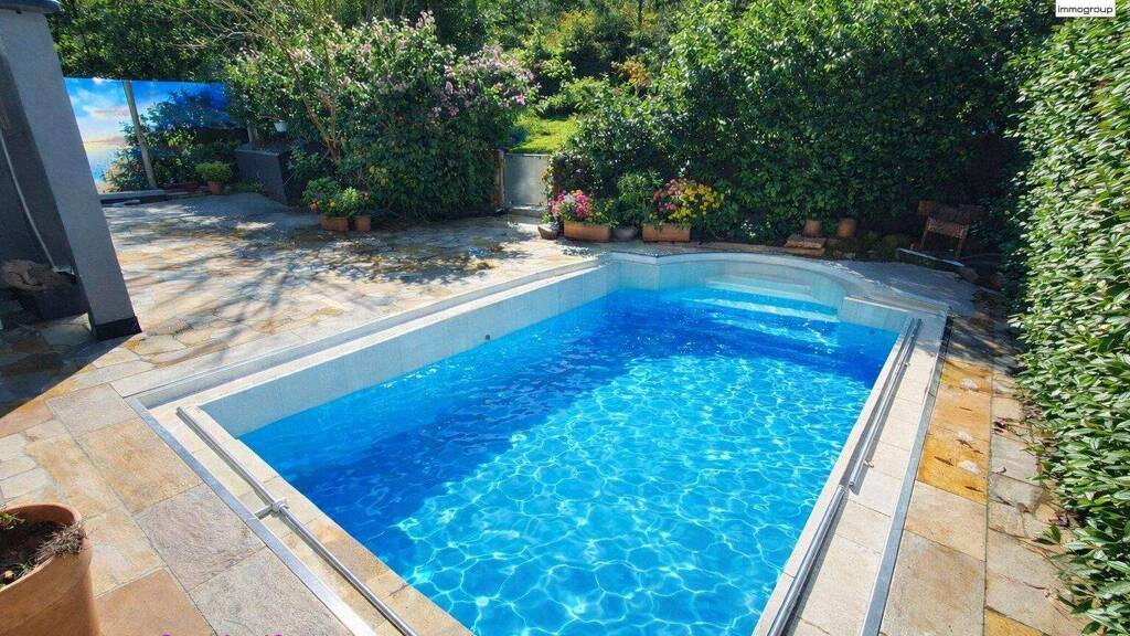 Von hier aus erreicht man über eine kleine Stiege auch die Wellnessoase im Untergeschoss. Für Ihr persönliches Wohlbefinden ist eine Sauna und eine Infrarotkabine vorhanden. In einem weiteren Raum befindet sich ein Whirlpool, ein Dampfbad und eine extra Dusche. Die Räume sind vielseitig nutzbar, ob als Fitnessinsel oder Partykeller, alles ist möglich und im Winter besonders angenehm. In den wärmeren Monaten bietet der Garten mit großen Terrassenflächen, nahezu uneinsehbar, ein privates Paradies mit Pool (noch zum Fertigstellen) und einem beheizbaren SWIMSPA mit Gegenstromanlage und einer Außendusche. Der Feierabend lässt sich mit der vorhandenen Grillstelle besonders genießen. Falls sich die neuen Bewohner lieber eine Rasenfläche anstatt des Pools wünschen, wird dies auf Kosten der Eigentümer umgesetzt.