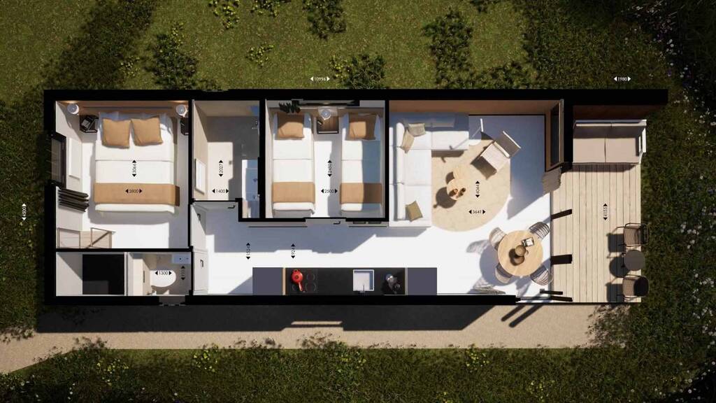 Diese freistehende, ebenerdige Lodge ist für 4 Personen geeignet. Innen und außen sind durch große Fenster und Fenstertüren verbunden. Im Wohnzimmer mit offener Küche können Sie gemeinsam faulenzen, kochen und essen. Das Wohnzimmer ist ebenso hell wie die Küche, die durch ein großes Fenster mit dem Grün rund um das Haus verbunden ist. Im Wohnzimmer gibt es außerdem eine Fußbodenheizung. Durch die große Glasfront haben Sie bei jeder Tasse Kaffee die Wahl: Soll es drinnen oder draußen genossen werden?