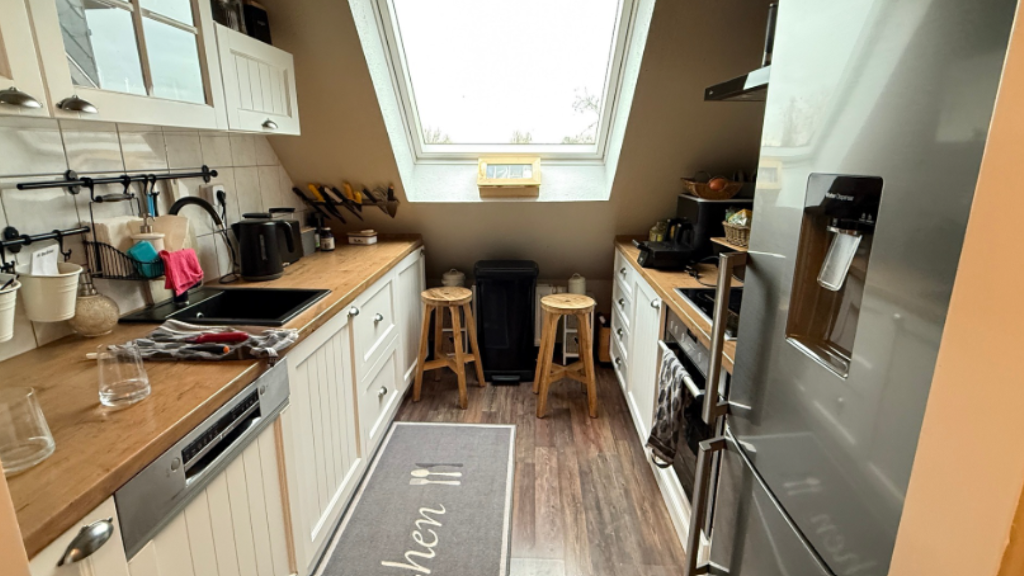Ergänzt wird die Wohnung durch eine separate Küche, ein Badezimmer sowie einen zentralen Flur, der alle Räume sinnvoll miteinander verbindet. Die Raumaufteilung ist sowohl für Paare als auch für kleine Familien oder langfristige Mieter sehr gut geeignet.