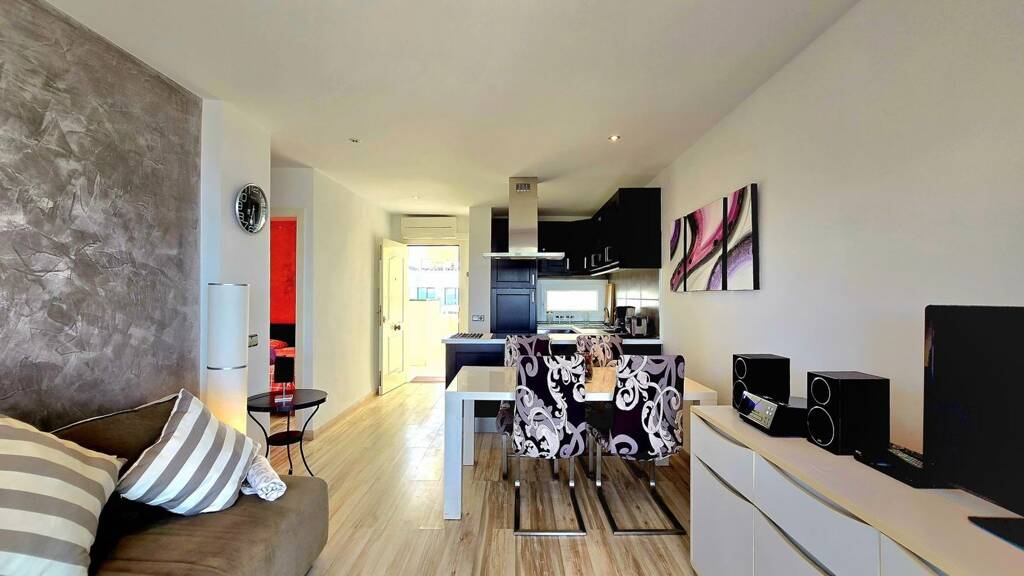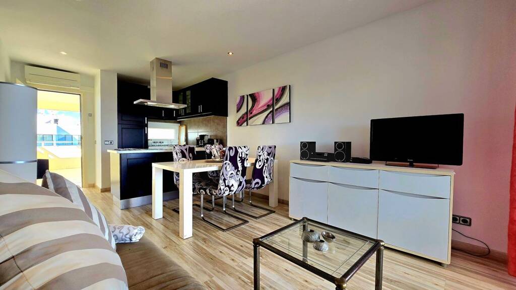 Die Aufteilung umfasst ein helles Wohn- und Esszimmer mit offener, vollständig ausgestatteter Küche, zwei Doppelschlafzimmer mit Einbauschränken sowie ein komplettes Badezimmer mit Dusche. Zusätzlich bietet die Immobilie eine gemütliche, verglaste Terrasse, die ganzjährig genutzt werden kann.
