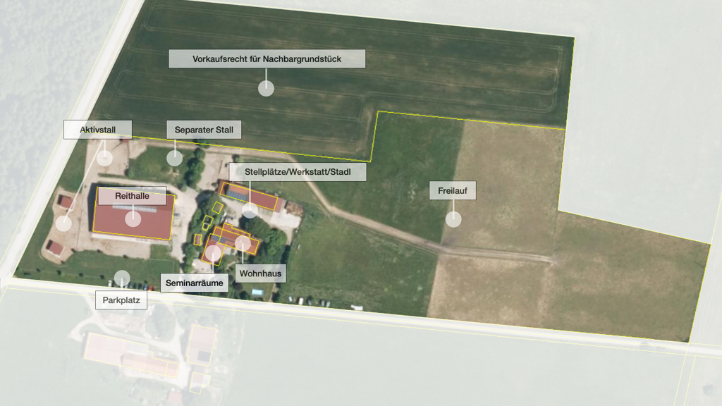 Ein besonderes Highlight ist das gesicherte, zum Objekt gehörende Vorkaufsrecht für das nördlich angrenzende Nachbargrundstück mit mehr als 2,3 Hektar Fläche. Dieses eröffnet zusätzliche Arrondierungs- und Erweiterungsmöglichkeiten.