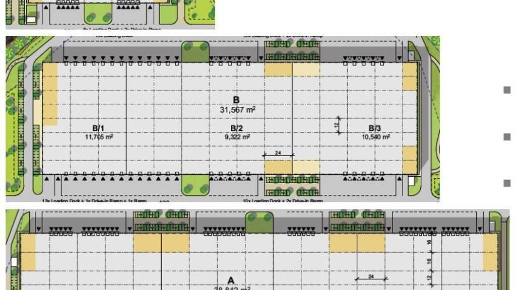 Verfügbare Hallenflächen (BGF) - Gebäude C: 7.399 m² - Gebäude B: 31.567 m² (cross dock geplant) (teilbar ab ca. 9.322 m²) - Gebäude A: 38.842 m² (teilbar ab 4.954 m²)