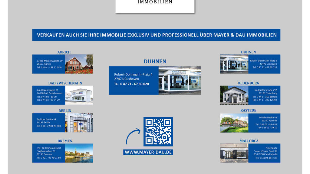 Der bildschöne und langläufige Sandstrand ist in wenigen Schritten erreicht, und lädt zum Erholen und Entspannen für die ganze Familie ein. An der nördlichsten Spitze Niedersachsens ist Cuxhaven gelegen, unmittelbar an der Mündung der Elbe in die Nordsee. Die Stadt gehört zu den ältesten "Nordseeheilbädern" und ist weit über die regionalen Grenzen hinaus bekannt und sehr beliebt als Ferienort. Duhnen, als Stadtteil von Cuxhaven, ist einer der wichtigsten Fremdenverkehrsorte Niedersachsens am Wattenmeer und wird von Hotels, Pensionen, Ferienappartementhäusern und Einrichtungen der Gastronomie sowie einem Erlebnisbad geprägt. Mehrere Lebensmitteleinzelhändler ebenso wie kleine Boutiquen versorgen Einwohner und Touristen mit dem Notwendigsten als auch den schönen Dingen des Lebens. Wellnessangebote laden zum Entspannen ein. Maturfreunde kommen mit Wattwagenfahrten und Wattwanderungen zur Insel Neuwerk auf ihre Kosten. Und Freunde des Pferdesports dürfen mit dem Duhner Wattrennen eine traditionelle Attraktion genießen.