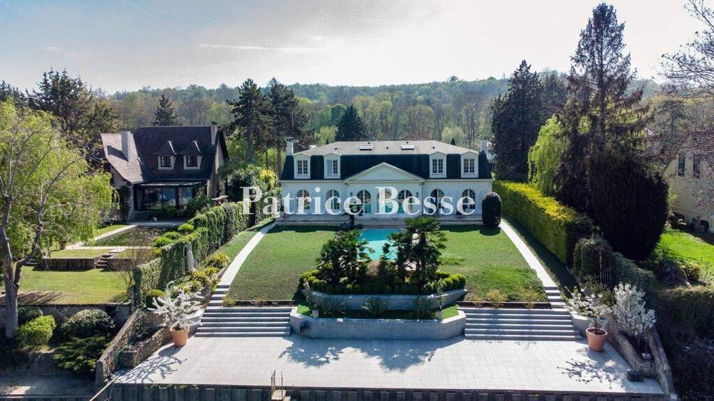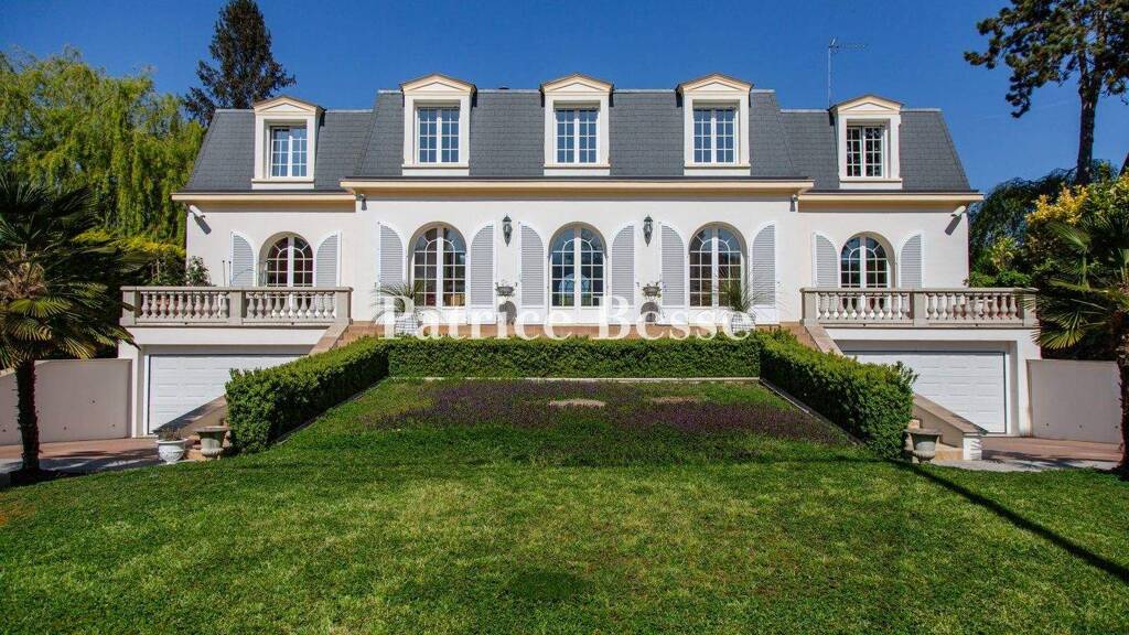 On the plot, which covers 1,500m², the dwelling stands at the top of a landscaped garden that surrounds the house with greenery. The edifice is rectangular with elevations coated with pale rendering and a mansard roof punctuated with dormers. The front section of the grounds, where you find the entrance, is on a gentle slope. It is surrounded by much vegetation, made up of shrubs, cypresses and box, and is symmetrically designed, with two side driveways for vehicles and two flights of steps that lead up, in parallel, to a vast terrace. At the back, the dwelling looks down over the River Seine. Here, you can admire an unrivalled view of the opposite riverbank where there is a lush park: the Parc du Peuple de l'Herbe. The garden stretches down to the river, where a private quay, made of granite, can be used to moor a boat. In the middle of this garden, in line with the house, lies an outdoor swimming pool, which extends the rear terrace that the reception room leads out onto. The edifice offers a liveable floor area of around 350m², spread out over the ground floor and first floor, and roughly 220m² in the basement. A lift takes you to all the levels.