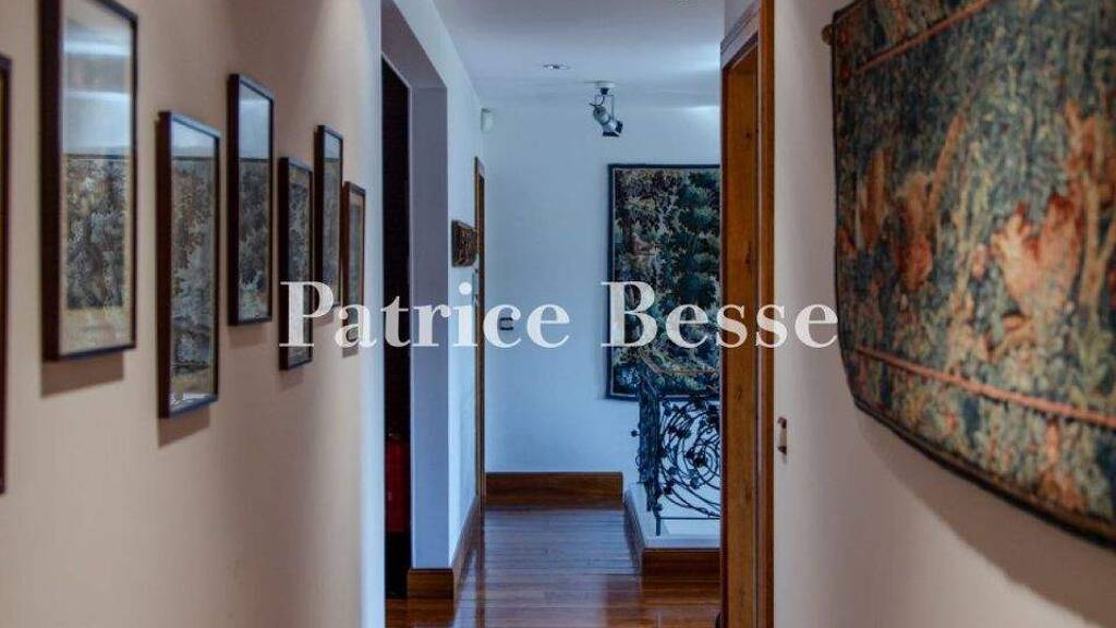 The home's layout is designed to host guests. The building takes up a 164m² surface area on the ground. The entrance door leads into a spacious hallway with a floor of pale tiles. On the left, there is a guest lavatory. On the right, there is an office. Straight ahead, centrally positioned, there is a vast lounge, bathed in natural light from several arched French windows through which you can admire a view of the River Seine and the parkland on the other side of it. The reception spaces offer a total floor area of around 120m². They include a reading room that connects to a vast, central living room, which, in turn, connects to a second lounge with a fireplace and, finally, a dining room that connects to the kitchen. With the many windows, you can enjoy a sweeping view outside, across the terrace and swimming pool. The kitchen, which connects to the dining room, has a scullery and offers a 30m² floor area. You can reach it from outside, from the two sides of the house, and from inside, from a cloakroom. There is an office at the end of the lounge. This office could be an extension of the reception space. Its walls are lined with furniture made of solid wood. Plaster medallions with musical and gastronomical motifs embellish some of the walls of the ground floor rooms. In a corner of the reading room, there is a staircase that leads up to the first floor. This staircase has a wrought-iron Spanish balustrade in an 18th-century style. It flanks both sides of the first steps, then edges the flight of stairs up to the landing.
