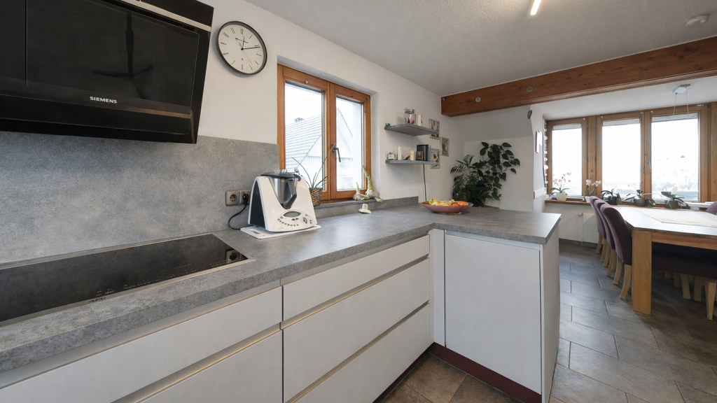 Die Küche ist offen in den Essbereich integriert, wodurch sich ein zusätzlicher, flexibel nutzbarer Bereich innerhalb des Wohnkonzepts ergibt.