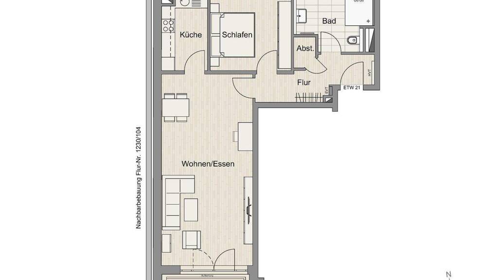 Der abgebildete Grundriss und die Architekturvisualisierung zeigen nur eine Beispielmöblierung zur besseren Veranschaulichung. Die Wohnung wird unmöbliert verkauft, die Einbauküche ist im Preis inbegriffen. Im Bad noch nicht dargestellt ist die im Preis enthaltene Glasduschtrennwand.
