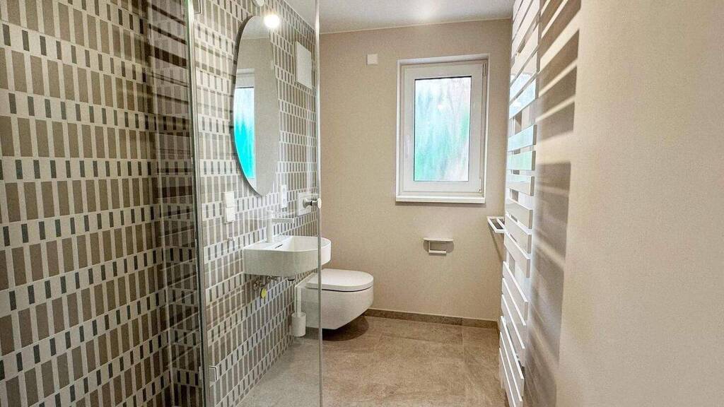 Das ausgewählte Innendesign zeigt sich durch ein durchdachtes und einheitliches Farbkonzept sowie in jedem Detail: hochwertiges Stäbchenparkett, moderne Fliesen, stilvolle Designleuchten und edle Armaturen schaffen eine durchgehend stimmige und moderne Atmosphäre im gesamten Haus.
