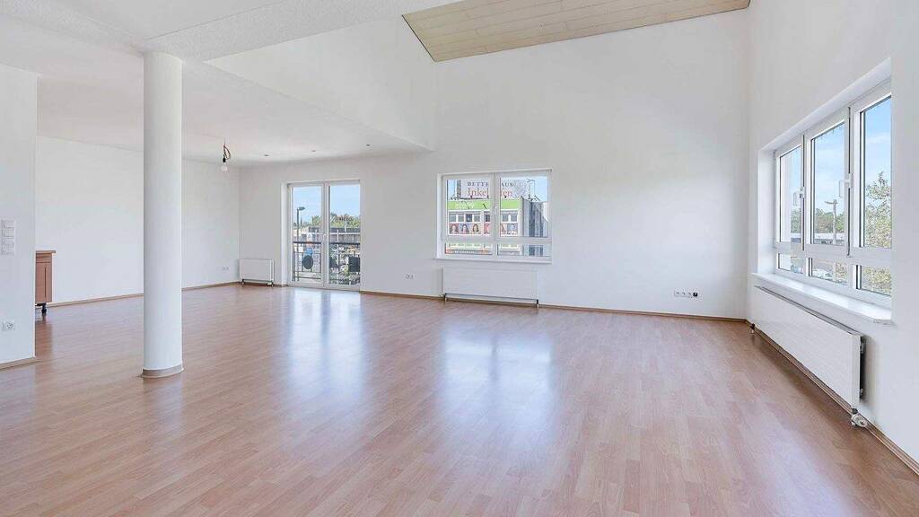 Herzstück der Wohnung ist das beeindruckende Wohnzimmer mit hohen Decken und Galerie, das ein außergewöhnliches Raumgefühl und viel Tageslicht bietet. Die offene Wohnküche fügt sich harmonisch in den Wohnbereich ein und lädt zum gemeinsamen Kochen und Verweilen ein, ideal für Familien oder Paare, die großzügiges Wohnen schätzen.
