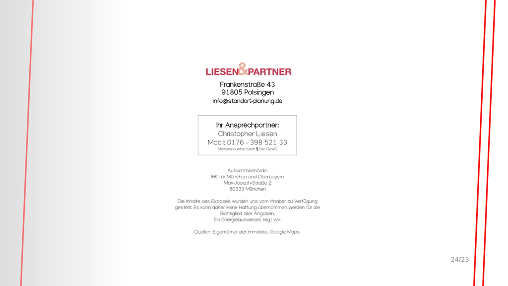Die wichtigsten Daten - ruhige Lage mit schönem Garten, dennoch zentral - Kaufangebot beinhaltet Grundstück mit Einfamilienhaus, Garage & Gartenhaus - hochwertige Ausstattung – u.a. schöne Einbauküche - Wohnfläche EG 48,52m² / 1.OG 50,75m² / DG 28,94m² = 128,21m² - ca. 302m² Grundstücksfläche - Übernahme möglich ab sofort Kontinuierliche Renovierungen (Teilauszug): 2011 - Dach & Dachziegel neu + Bad 2.OG neu 2013 - Bad 1.OG neu 2016 - Küche neu 2025 - moderne Ölheizung neu Das von uns zum Verkauf angebotene Grundstück mit Wohnhaus befindet sich in sehr guter Lage in München-Pasing. "Ruhig und doch zentral" ist hier das Motto. Im beliebten Münchner Süden sind traditionell vielfältige Einkaufsmöglichkeiten, nahgelegene Ärzte, Schulen & Kindergärten sowie Restaurants, Bars und andere wichtige Infrastruktur zu finden. Auf dem schönen Grundstück befindet sich ein gepflegtes Reihenendhaus mit Garten und Gartenhaus, sowie eine Garage. Das Haus wurde im Jahr 1962 gebaut, immer gut gepflegt und mehrfach renoviert. Man gelangt fußläufig in 15 Minuten zum (Fern-)Bahnhof München-Pasing. Der neu entstehende Bahnhof „ Am Knie“ wird in nur 10 Minuten zu Fuß erreichbar sein. Der sehr gut ausgebaute Nahverkehr, bestehend aus Bus, Tram und S-Bahn, sichert eine perfekte öffentliche Erreichbarkeit. Bei Rückfragen oder um einen Besichtigungstermin zu vereinbaren, können Sie mich gerne jederzeit kontaktieren.