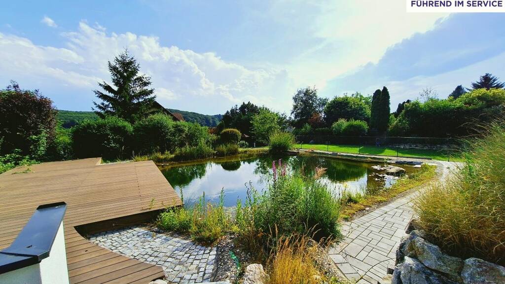 Mit dem Naturbadeteich, der gepflegten Anlage, der luxuriösen Zufahrt und dem Panoramablick entsteht hier ein privates Refugium der Extraklasse.