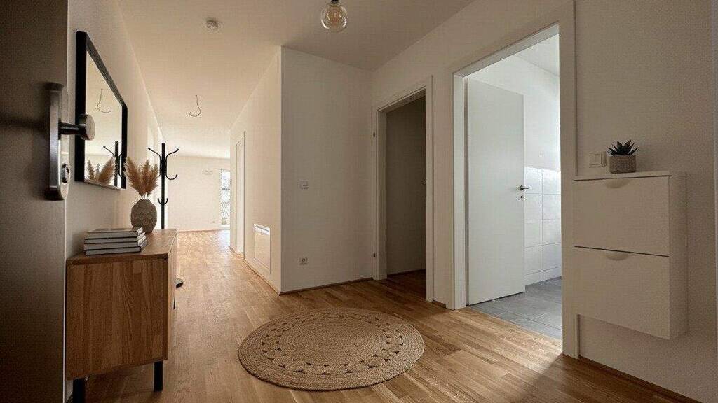 Die Ausstattung überzeugt durch hochwertige Materialien. Ein edler Eichenparkettboden sorgt für eine angenehme Wohnatmosphäre, während weiße Holzfutterstöcke und moderne Details den hochwertigen Charakter der Wohnung unterstreichen.