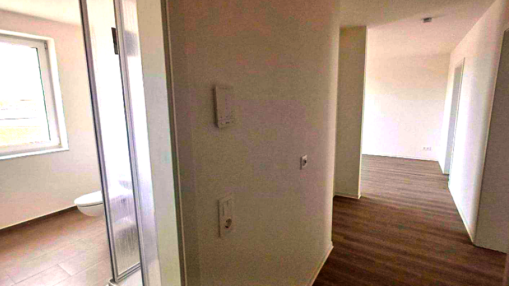 Das Badezimmer verfügt über eine Dusche und ein Fenster. Die offene Wohnküche bietet mit ca. 20 Quadratmetern viel Platz.
