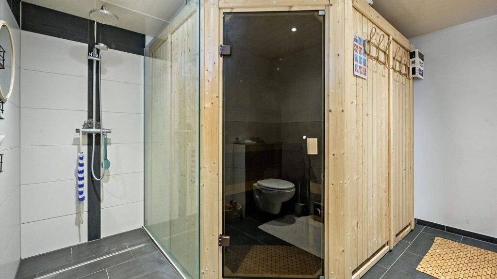 Im Untergeschoss ist neben den Nutzräumen, sowie dem Heizungs- und Öllagerraum, eine Sauna.