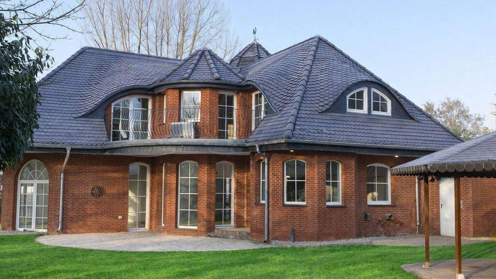 Diese charmante Landhausvilla wurde 1997 in solider Massivbauweise errichtet und überzeugt durch ihre außergewöhnliche Architektur mit Schwalbenschwanzdeckung, Fledermausgauben und dekorativen Türmen. Großzügige Raumhöhen, weitläufige Fensterflächen mit innenliegenden Sprossen sowie die repräsentative Gestaltung schaffen eine helle und zugleich elegante Wohnatmosphäre.