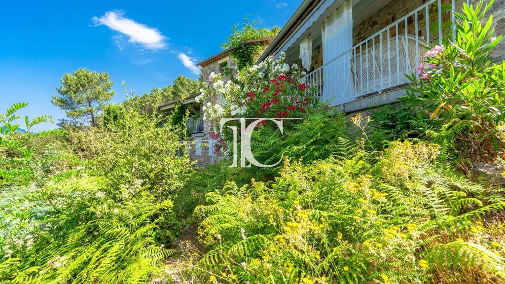 Außend an lädt ein 9x5 m großer Pool zur Entspannung in einem perfekt gestalteten 5151 m² großen Grundstück ein. Die Terrasse bietet ein außergewöhnliches Panorama, ideal um die Ruhe des Ortes zu genießen. Eine Garage ist ebenfalls vorhanden, und die Kläranlage wurde kürzlich installiert.