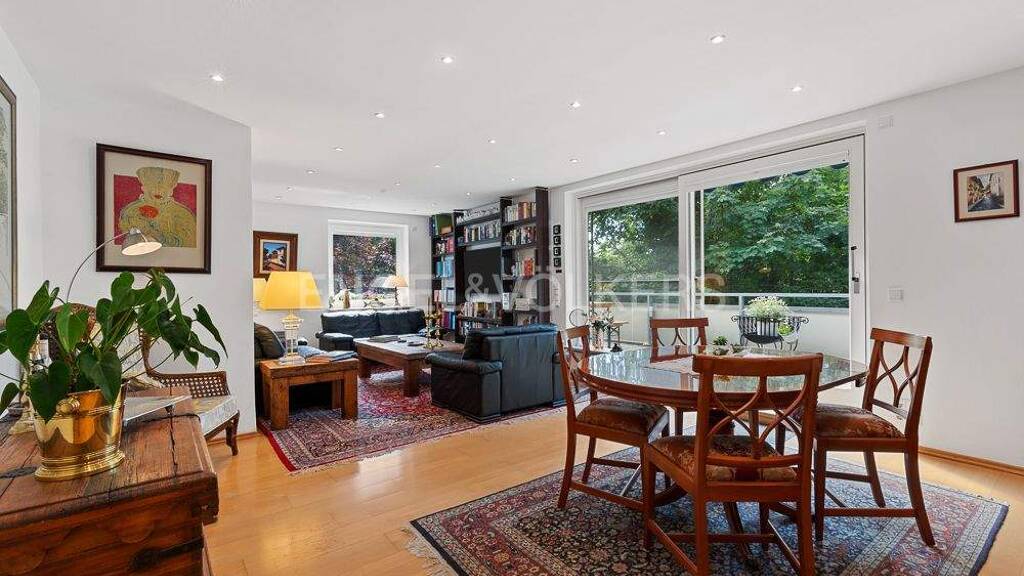 Sie betreten die Wohnung durch einen großzügigen Flur, von dem die schöne Landhausküche, ein Gäste-WC mit Lichtschacht und das ca. 33m² große Wohnzimmer, nach Süden ausgerichtet, abgehen. Mediterranes Feinsteinzeug und Parkett wechseln sich in unserer Wohnung ab und vermitteln eine warmes und gemütliches Wohnambiente. Die Decken im Eingangsbereich und im Wohnzimmer sind abgehängt und mit Einbaustrahlern versehen.
