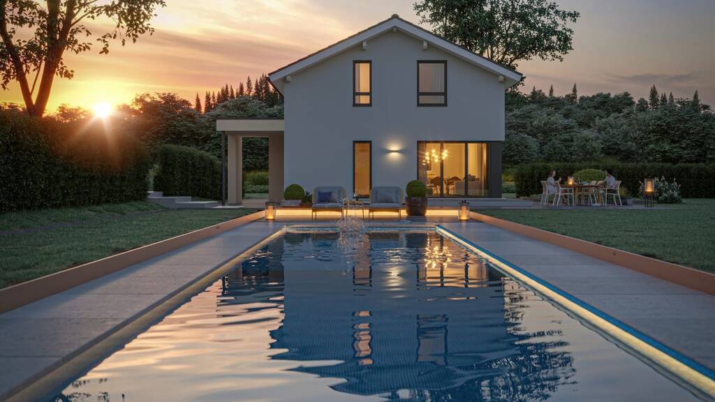 Dieser Entwurf besticht mit seiner schlichten Formensprache: Ganz ohne Schnörkel oder überbordende Verzierungen weiß es sich gegenüber der umliegenden Bebauung zu behaupten. Im Mittelpunkt steht ein quaderförmiger Baukörper, der nur durch eine große Eingangsüberdachung ergänzt wird. Das flach geneigte Satteldach mit den schmalen Dachüberständen harmoniert perfekt mit der reduzierten Optik. Den modernen Wohnwünschen entsprechend öffnet sich das Fertighaus seiner Umgebung mit großzügigen Fensterflächen. Sie reichen von vertikalen und horizontalen Lichtbändern bis hin zur raumhohen Übereck-Verglasung. Einen sehr eleganten Touch erhält das Gebäude durch die anthrazitfarbenen Fensterrahmen, die zusammen mit der dunklen Dacheindeckung einen schönen Kontrast zur strahlend weißen Putzfassade bilden. Damit es auch am Abend gut zur Geltung kommt, können Bauherren Spots in die Dachüberstände integrieren lassen. Der Eingang befindet sich auf der Traufseite. Er kann aber - je nach Grundstückssituation - auch auf die Giebelseite gelegt werden. Das Innere des Hauses präsentiert sich überraschend offen. Erschlossen wird das Erdgeschoss von einer luftigen Diele mit Garderobenbereich: Hier können sich auch mehrere Personen aufhalten, ohne dass Gedränge entsteht. Gerade Familien mit mehreren Kindern oder Hausbesitzer, die gerne Gäste empfangen, werden diesen Vorteil zu schätzen wissen. An die Diele schließen sich ein kompaktes Gäste-WC und ein Hauswirtschaftsraum an. Ein breiter Durchgang führt die Besucher und Bewohner in das Herz des Hauses: den großzügigen Wohn-, Ess- und Kochbereich. Die fließenden Raumübergänge ermöglichen eine besonders familiäre Nähe: Während die Eltern das Essen vorbereiten, stehen sie jederzeit mit den Sprösslingen, die entweder fernsehen oder auf dem Fußboden spielen, in Kontakt. Eine Auszeit vom Familienleben finden die Bewohner im Dachgeschoss, das mit einem Kniestock von 1,60 m fast genauso viel Bewegungsfreiraum bietet wie das Erdgeschoss. Zwei annähernd gleich große Kinderzimmer, ein Elternschlafraum mit großem Ankleidebereich und ein gemütliches Badezimmer laden zum Entspannen ein.