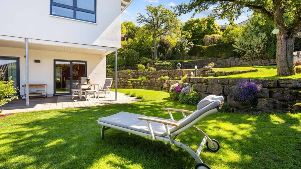 Sowohl von der Küche als auch vom Essbereich haben Sie Zugang zur überdachten Süd-Terrasse und zum Gartenbereich. Der Gartenbereich wurde vor ein paar Jahren komplett neugestaltet und bietet Ihnen verschiedene Ebenen zum Verweilen. Die abgebildete Einbauküche ist ebenfalls im Kaufpreis enthalten.